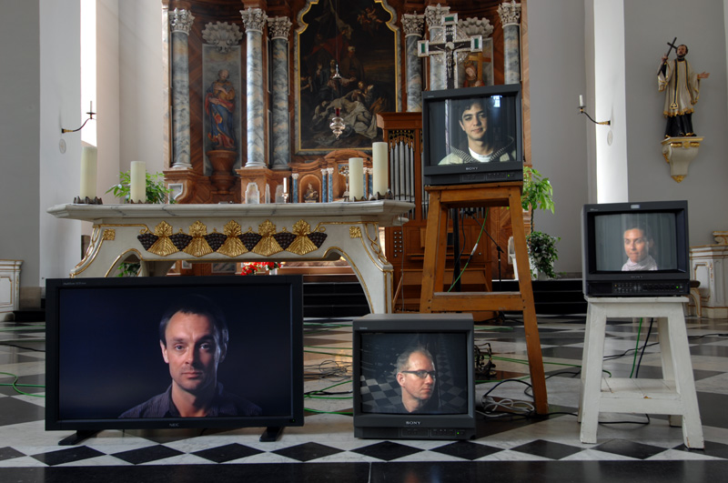seeme / monologe zeigt Menschen, die im Spiegel sich selbst betrachten. Die Installation in der St. Laurentiuskirche Wuppertal zeigt eine Reihe dieser Videoportraits im Dialog miteinander.